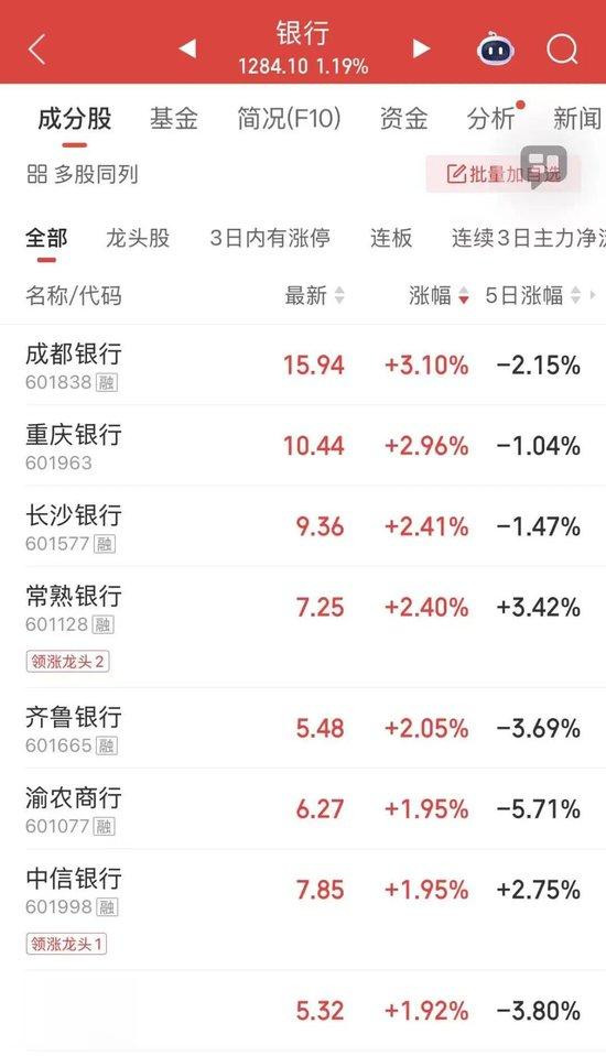 今日,银行板块上涨,成都银行、渝农商行、中信银行等上涨。